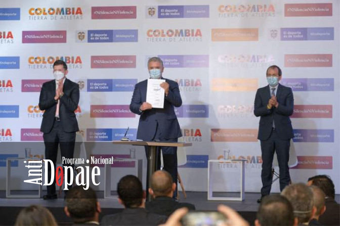 Bogotá D.C., marzo 3 de 2021. Con hechos que dan cuenta de los avances en materia de lucha antidopaje en Colombia, el presidente de la República, Iván Duque, entregó las obras de adecuación del Laboratorio de Control al Dopaje y sancionó la Ley que creará el Tribunal Disciplinario Antidopaje, dos acciones que se suman a la promulgación de la Ley 2083, socializada el pasado 18 de febrero.