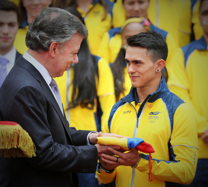 Ese sentimiento recobra cada vez más fuerza y validez. Así se evidenció este jueves en la Plaza de Armas de la Casa de Nariño, donde el presidente Juan Manuel Santos le entregó al gimnasta Jossimar Calvo el pabellón nacional, el cual llevará el cucuteño en las máximas justas del deporte, los Juegos Olímpicos, que tendrán lugar en Rio de Janeiro del 5 al 21 de agosto próximo. Allí, Colombia demostrará que es un territorio que brilla como el oro y la paz.