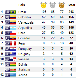 Colombia completó un total de 42 oros, 37 platas y 48 bronces, para un total de 127 medallas, que la mantienen en el segundo lugar detrás de Brasil, que suma 79 doradas, 50 de plata y 60 de bronce.