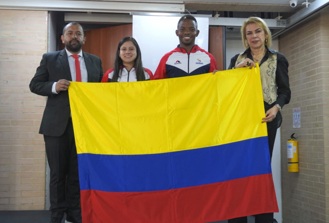 Gian Marco Andrade, atleta medallista de plata en los Juegos Sordolímpicos 2022 y actual campeón mundial de los 100 metros planos, y Yuliana Valentina Mayorga, tenismesista y multicampeona continental en los Juegos Panamericanos de Sordos 2024, recibieron el pabellón nacional de manos de la ministra del Deporte, Patricia Duque Cruz.