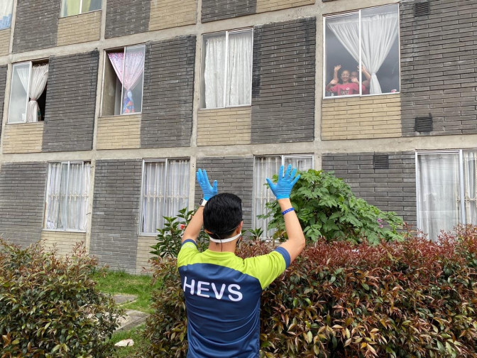Bogotá, 2 de mayo de 2020. Después de su primer día de actividad en Bogotá, "La Ruta del Movimiento" siguió avanzando por la capital de país y llegó hasta la localidad de Puente Aranda para dirigir sesiones de actividad física y recreación.