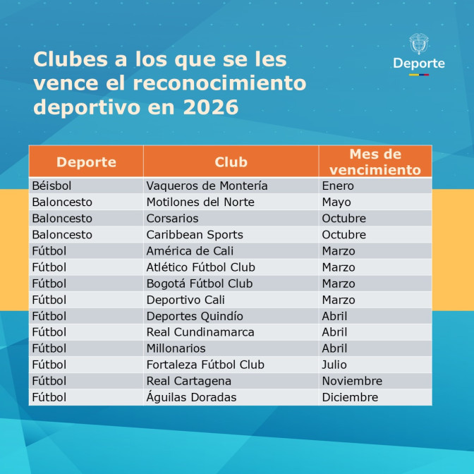 Para la vigencia 2026, se tiene previsto el vencimiento del reconocimiento deportivo de los siguientes clubes profesionales (no se incluyen aquellos que ya adelantaron el trámite y cuyo acto administrativo se encuentra debidamente ejecutoriado) - Imagen adjunta.