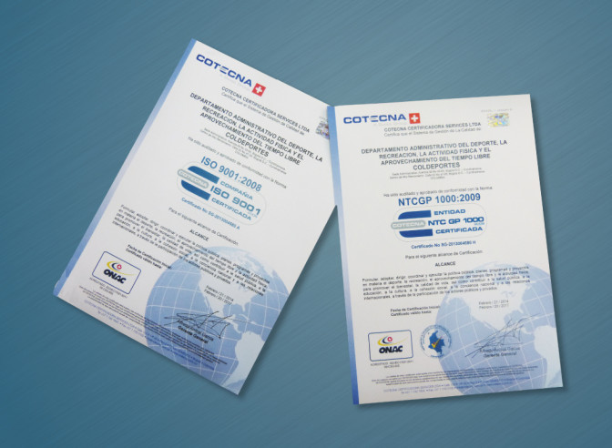 Una vez realizada la auditoria externa por parte de COTECNA, COLDEPORTES recibió este martes la certificación en las normas ISO 9001:2008 y NTC GP: 1000: 2009. Un trabajo que se inició desde el año 2013 con la implementación del Sistema Integrado de Planeación y Gestión, de acuerdo con el decreto 2482 de 2012.