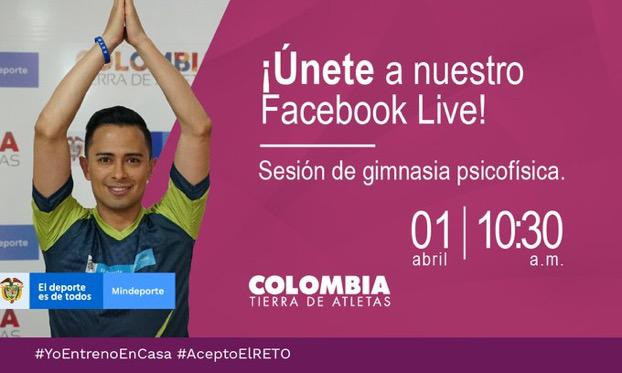 Bogotá, 1 de abril de 2020. El Ministerio del Deporte se encuentra desarrollando diferentes actividades para apoyar y orientar a los colombianos en el cuidado de salud física y mental durante la etapa de cuarentena que se vive en el país como consecuencia de la pandemia por el virus COVID 19, una estas acciones es la transmisión en vivo de rutinas físicas a través de Facebook Live para que personas y familias se mantengan activos durante el aislamiento.