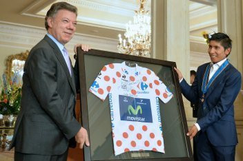 En horas de la tarde de este martes y luego de la majestuosa bienvenida que hicieron los bogotanos, Quintana fue recibido por el Presidente Juan Manuel Santos, por el director de Coldeportes, Andrés Botero Phillipsbourne y los principales dirigentes deportivos del país. ?Al doctor Botero, Director de Coldeportes (Andrés), la pesada del ciclismo aquí presente en este evento tan importante; a Lucho Herrera, a Fabio Parra, a Santiago Botero, a Martín Emilio ?Cochise? Rodríguez y Álvaro Mejía, todos ustedes también nos han dado momentos de gran felicidad a los colombianos y nuestro agradecimiento por ello?. Con estas palabras el Presidente de la República Juan Manuel Santos, abrió el acto de recibimiento al ciclista Nairo Quintana. Desde Coldeportes, es grato contarle a Colombia que gracias al apoyo del gobierno nacional, reflejado en cada uno de los programas que buscan la formación de talentos deportivos, es que el país puede sentirse orgulloso de los excelentes resultados de deportistas como Quintana, que comenzó su participación en los Juegos Intercolegiados, hoy Supérate-Intercolegiados, iniciados desde hace más de 30 años y que luego de hacer parte de equipos como el Boyacá es para Vivirla, vistió los colores del Colombia es Pasión, apoyado también por Coldeportes, con el que ganó el Tour de l?Avenir en 2010. Este programa, entre otros como los de recreación y actividad física, han sido la plataforma de lanzamiento para miles de deportistas que han encontrado un espacio para fortalecer sus habilidades, dar a conocer su talento y posteriormente, proseguir una carrera deportiva de la mano de cada uno de los miembros del Sistema Nacional del Deporte. El recorrido que Nairo Quintana ha hecho en su carrera deportiva desde su participación en Intercolegiados, es un ejemplo de la constancia, disciplina y trabajo que pueden adquirir miles de niños y jóvenes que hoy participan en Supérate, considerado hoy como programa bandera del gobierno nacional. El joven de 23 años, dio sus primeros pedalazos en las competencias nacionales de los juegos escolares del 2007 en donde se ubicó tercero en la prueba de ruta. Quintana, pequeño de estatura, pero inmenso de voluntad, ha logrado meterse en el corazón de todos sus compatriotas, ha hecho vibrar el país con sus triunfos y le ha demostrado a todos los colombianos que se puede soñar, que nada es imposible si se trabaja con disciplina y pasión, y que superarse esta en cada uno. En el acto celebrado ayer en Palacio, el presidente Santos extendió un agradecimiento a Quintana en nombre de los 47 millones de colombianos por el esfuerzo y por el ejemplo que representa para todos. El primer mandatario señaló además que: ?Nunca en nuestra historia habíamos tenido tantos éxitos en nuestros deporte, como en estos tres años, doctor Andrés Botero (Director de Coldeportes). Aquí tuvimos a Mariana Pajón y a los medallistas de los Olímpicos. Nunca habíamos obtenido tantas medallas en los Olímpicos, o en los Panamericanos, o en los Centroamericanos. Fuimos séptimos, pero fuimos el primer país latinoamericano en los Juegos Mundiales que se acabaron de celebrar en Cali?. Nairo queda en la mente de los colombianos, como lo han hecho ?Cochise? Rodríguez, Lucho Herrera, Fabio Parra y todos los demás que han hecho historia en el ciclismo por sus grandes actuaciones como Félix Cárdenas, Santiago Botero, Álvaro Mejía, Oliverio Rincón, el ?Chepe? González, Victor Hugo Peña y Mauricio Soler, entre muchos otros jóvenes talentos que recientemente han hecho vibrar a los colombianos en las diferentes modalidades que ofrece el ciclismo, uno de los deportes que más triunfos y glorias le ha dado al país. Y de allí para su natal Boyacá, donde le esperan sus recuerdos, compañeros de infancia, muchos homenajes, pero sobretodo, el sancocho de gallina que le tiene preparado su madre.