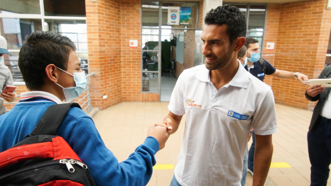 Éider Arévalo fue recibido con gran alegría y entusiasmo, este miércoles, por parte de los estudiantes y el cuerpo de docentes de la Institución Educativa Floridablanca, ubicada en la localidad de Engativá, en Bogotá, de la que se graduó como bachiller hace 12 años.