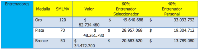 De igual forma, los entrenadores medallistas recibirán el 50 por ciento del valor del incentivo de la medalla obtenida por el atleta. En caso de obtener más de una medalla, se reconocerá únicamente la de mayor valor.