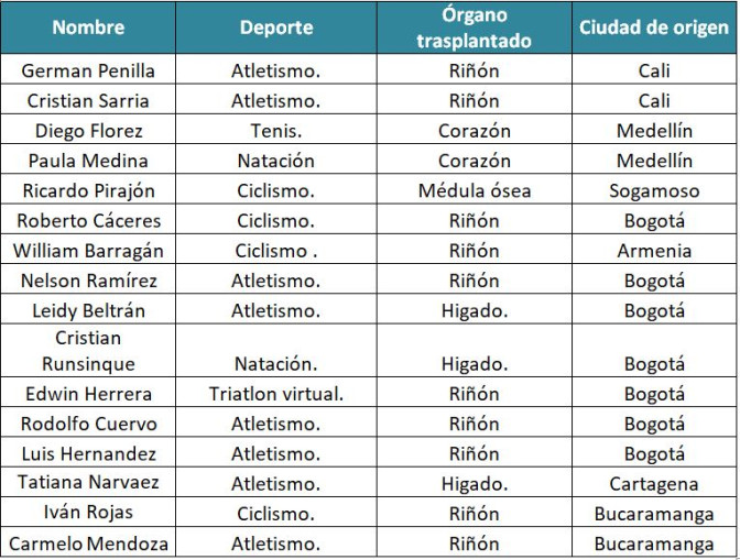 "Ustedes son el claro ejemplo de que cuando hay ganas de vivir y de ser deportistas no hay obstáculos. Son ejemplo de resiliencia. Saben enfrentar la adversidad de una manera positiva. Como dirigente, siento un orgullo enorme al entregar esta bandera, porque es hacer un homenaje a quienes entregaron sus órganos y permitieron que otros pudieran vivir", señaló el director de Coldeportes, Ernesto Lucena Barrero, durante su intervención en el acto que tuvo lugar en Bogotá. Los IX Juegos Latinoamericanos contarán con la presencia de más de 400 atletas provenientes de Argentina, México, Chile, Paraguay, Colombia, Brasil, Uruguay, Ecuador, y España, este último como país invitado.Varios de los deportistas colombianos que participarán en este torneo también representaron al país el año pasado en los Juegos Mundiales para Artistas Trasplantados realizados en Málaga, España. Tal es el caso de German Penilla quien repite luego de alcanzar medalla de plata en atletismo 800m y bronce 1500 m.La competencia, además de demostrar las historias de éxito de los diferentes atletas, servirá como clasificatorio para los juegos mundiales de Newcastle Inglaterra que se realizarán en el año 2019."Tenemos el compromiso de demostrarle al mundo que la donación de órganos no solo ha permitido salvar la vida de millones de personas, sino que es una oportunidad y un impulso para alcanzar los sueños más grandes, como los que han tenido estos deportistas", aseguró Ignacio Correa, presidente de Colsanitas. Los uniformes tendrán un diseño novedosoLos uniformes que utilizarán los deportistas de la Selección Colombia cuentan con un novedoso diseño ya que son flores que tienen forma de órganos (Ver imagen). La creadora de este concepto es la artista colombiana Ana María Arango Ramírez. Para pintar este cuadro solo me basto pensar en las experiencias y personas que he escuchado, en las historias de Paula mi amiga, como mi hermana mayor, segunda madre, algo así ... De quien he aprendido que para vivir y luchar lo que se necesitan son ganas, Paula tiene un corazón nuevo desde hace tiempo, una de las afortunadas en recibir una segunda oportunidad para continuar luchando por sus sueños. Su historia, que es una entre tantas me motivo a pintar los órganos floreciendo, para representar la continuación del ciclo de la vida como flores al retoñar. " al cuadro lo llame "Floreciendo la vida ". Ana María Arango. te es el listado oficial de la Selección Colombia de Deportistas Trasplantados que participará en los IX Juegos Latinoamericanos entre el 30 de octubre y el 4 de noviembre en Salta, Argentina: